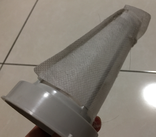 將塵盒再繼續拆解. 可以看到有三層空氣濾網結構. 最外層是一個拋棄式的初濾網. 中層是可水洗的濾網, 最後一層是活性碳濾網, 用來過濾味道的. 雖然不是HEPA 濾網, 但是也是有用心在設計成多層.