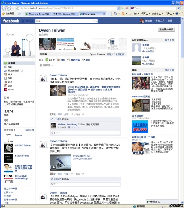 1. 加入粉絲團畫面:2. 最喜歡的影片: 影片(2) :dyson DC22 電視廣告3. 喜歡的原因:這影片充滿表現出dyson的強力吸力外, 更表達這樣子讓房子更整潔健康, 小孩子不會有吸入太多粉塵的機會, 更重要的是不減弱的吸力更是dyson的強力招牌! 讚!