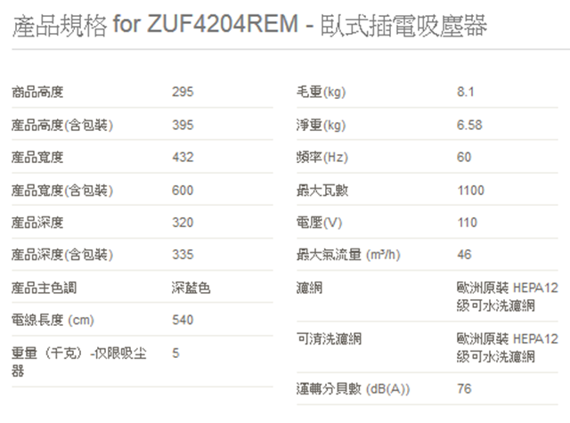 開箱前,來看一下伊萊克斯官網所列的產品規格說明。