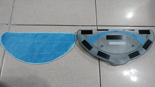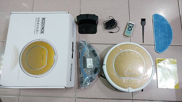 左至右 充電座/變壓器/遙控器/清潔刷/拖地布