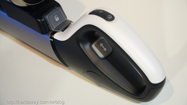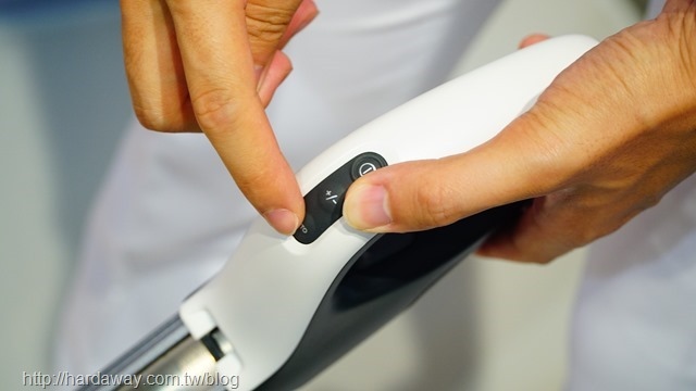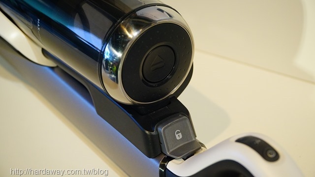 實按環形握把內部的伸縮把手高度調整鍵,實際調整Pure F9滑移百變吸塵器高度真的蠻很順手地移動。