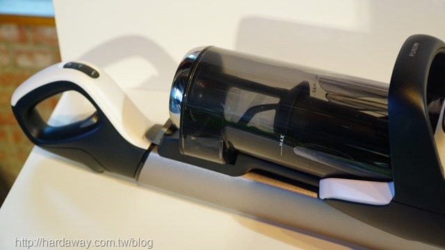 容量0.65公升的集塵盒,要倒掉裡面的髒污時也不會髒手,只要將集塵盒有Push鍵那端朝下,然後按下Push鍵讓下方蓋子開啟即可。另外,這個集塵盒清潔也很容易,因為它連同裡面的氣旋錐都可以水洗方式清潔呢!