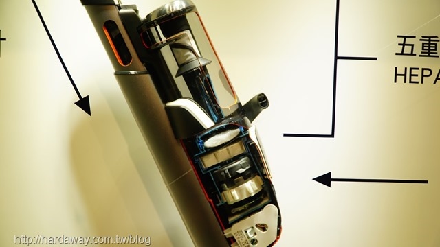 由於實機無法看到機身內部的數位馬達與長效電池,因此當天體驗會現場展示了一台機身透明的Pure F9滑移百變吸塵器,就能看到裡面的結構了。