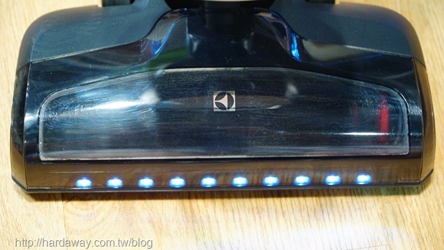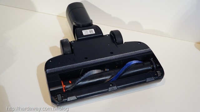 Pure F9滑移百變吸塵器能使用的吸頭,種類也很多元。以最常會使用的預設吸頭來說,上面配置了10顆LED吸頭前置燈,而且地板滾刷可輕鬆拆卸,不須使用硬幣。至於複合式刷毛設計,灰色刷毛蒐集大顆粒灰塵,藍色刷毛蒐集小顆粒灰塵,並且對硬質地板有拋光效果。另外,後側大輪的球狀承軸設計,讓操作更順手與穩固。