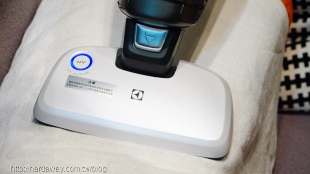 Pure F9滑移百變吸塵器接上UV床墊電動吸頭,然後按下UV啟動鍵啟動紫外線UV光,就能有效地清潔床墊。