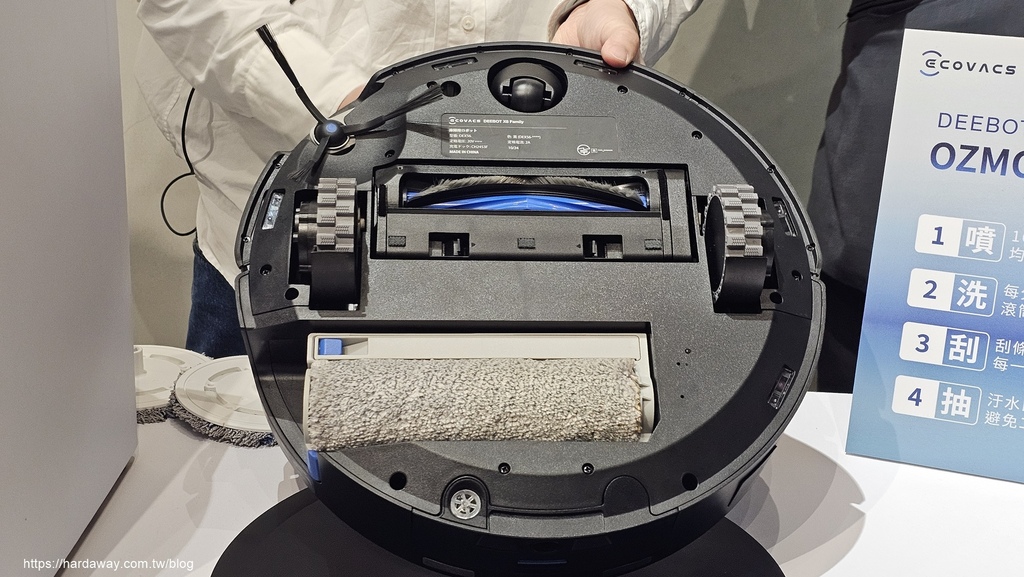 廠商代表將科沃斯ECOVACS X8 PRO OMNI翻過來,就可以很清楚地看到底部整個樣子。