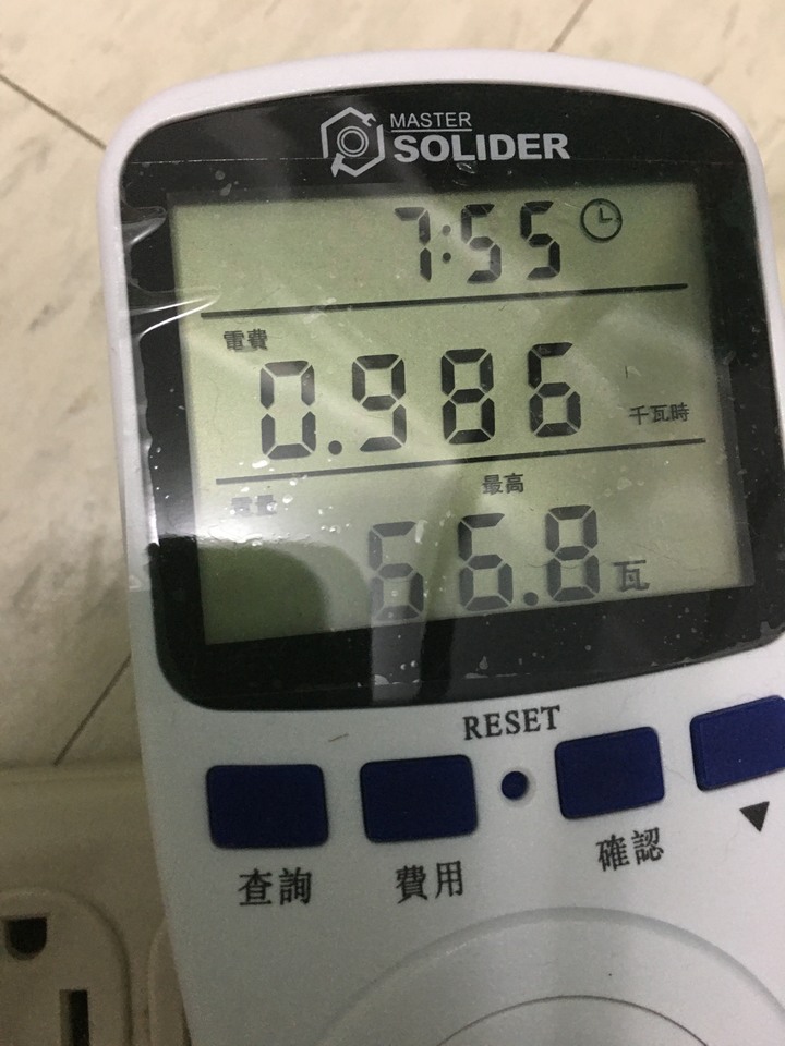 昨天(9/20)中午1200時重置電量監測器後離家赴父母親家過節,直至今日(9/21)1954分返家,總計31小時54分未使用冰箱,耗電量共0.986度,以32小時計算出未使用冰箱的狀況下,每24小時耗電量為0.7395度,每個月耗電量爲22.185度。