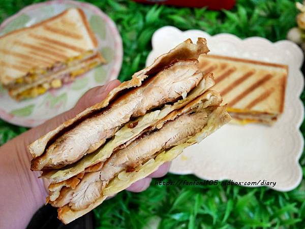 自製烤雞腿排,加上些許高麗菜絲熱壓,