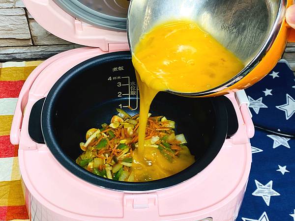 在電鍋中加入打勻的蛋液,