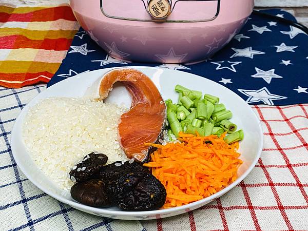 我在食材選擇上用了米、鮭魚、四季豆、紅蘿蔔、