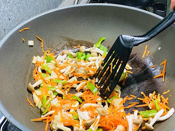 我將紅蘿蔔、鴻禧菇、青椒和洋蔥先拌炒過,