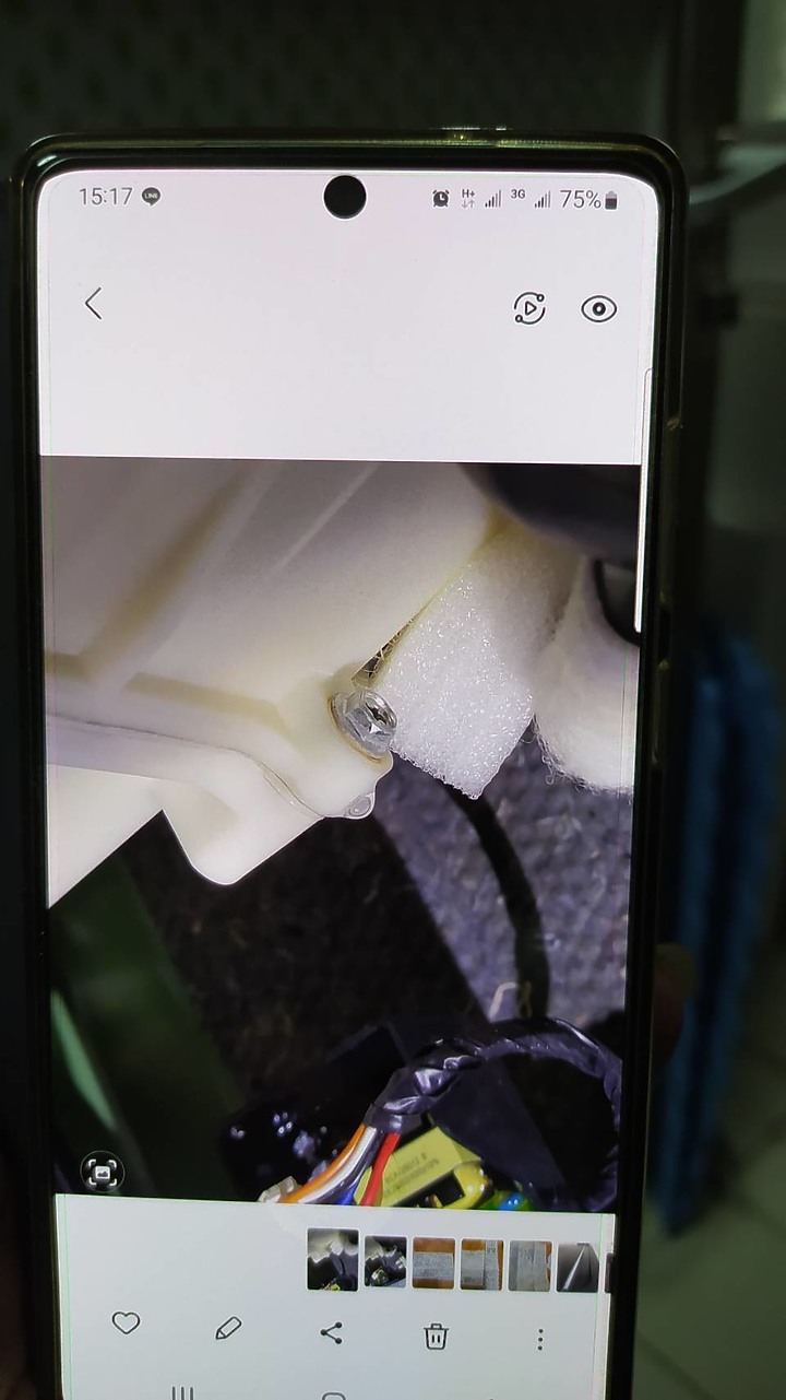 經過師傅詳細檢查後發現,是用來固定外桶桶身構造的周圍螺絲已經鬆脫造成漏水(據師傅說可以再鎖半圈)。由於洗衣機外桶是後半桶與前半桶兩截式構造,靠六角螺絲固定且防漏。師傅用手機拍下漏水聚集在螺絲下方的樣子給我看,確認漏水根本原因。師傅認為是機器生產線沒有鎖緊造成,但我認為生產時若沒鎖緊應該新機洗衣就會漏,而非天天洗脫烘,用了一年九個月之後才開始漏。而且這個漏水與內外桶連結的橡皮套破損應該也沒有關聯。我認為應該是下方負責吸震的避震器老化,無法吸去多餘震動之後,才會拖累螺絲鬆脫與皮套不堪震動摩擦而破損。但師傅不認為避震器有老化問題~~~