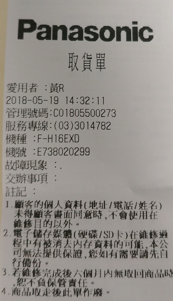 bbsguest wrote:國際牌四年內買了2...(恕刪) 上個月在小X電器買了國際牌最新款的F-H16EXD使用不到一個月就出現轉速及擺頭問題一台4千多塊的電風扇品質沒想到是這樣電風扇不小台,自行送修很麻煩一定要開車才能送去維修唉~修好還要開40分鐘的車去拿回來保佑修回來後不要再有什麼問題了附上取貨單
