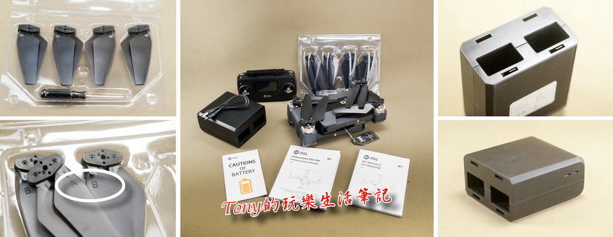 ▲《Holy Stone HS550無人機》所有的包裝內容物通通拿出來合照一張,其中槳葉有分A、B兩種不同方向的旋翼,如要更換舊的槳葉就要注意是A槳或B槳。