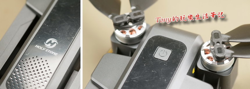 ▲左圖是機身上方有《Holy Stone HS550無人機》的LOGO,右圖則是靠機身前方的電源開關。