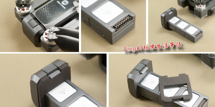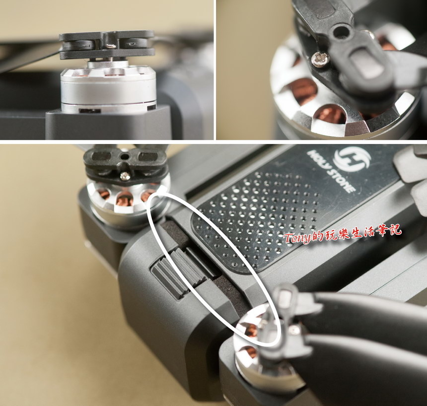 ▲每一組槳葉都是由兩顆螺絲固定在無刷馬達上,如果槳葉有破損就應該立即更換,更換時要注意是A槳或B槳。如果喜歡玩些障礙競賽飛行的話,那槳葉就會是耗損品了,這個不知道有沒有備品可以多買一些回來備用,這樣就更敢去嘗試飛行一些特別的技巧練習。另外在新購的《Holy Stone HS550無人機》電池上有套一個保護泡棉,這個我會建議每次收納時,就要套回電池上,以避免攜帶中不小心去碰到開機(雖然要長按電源才能開機,但仍要保持安全觀念,不使用時,電池套回泡棉,避免機身通電的任何可能)