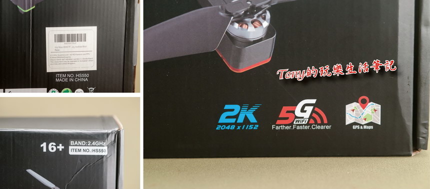 ▲外盒正面有提醒這是給16歲以上的人始用,畢竟飛行中的旋翼也算是兇器啊(第一次飛行就因為被陣風吹襲,差點飛進池塘,我緊急的用手去抓,立刻劃出了幾道小傷口),所以安全原因,最好別給小朋友獨自去玩。其實會選上《Holy Stone HS550無人機》也是因為它有2K的鏡頭,想說拍1080P影片應該就夠了(這部份在本文後面會有照片及影片檔分享出來)