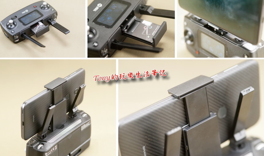 ▲手機的夾扣方式是在遙控器的上方,與大疆夾在下方的方式不一樣,我喜歡這種在上方的方式,手掌比較不會有蓋到畫面的問題。另外夾扣好手機時,手機要再往前扳,手機會跟遙控器有大約15度的夾角,如果不往前扳,手機會有些卡到遙控器上方的按鍵操作與天線的角度。還有手機可以夾住大約到6.2吋左右的手機,連我那之大到很多夾具都夾不住的ASUS Zenfone 2都可以夾的進去,應該不用擔心自己的手機會不會放不下,倒是我很想要試試能不能改用平板來試看看的。