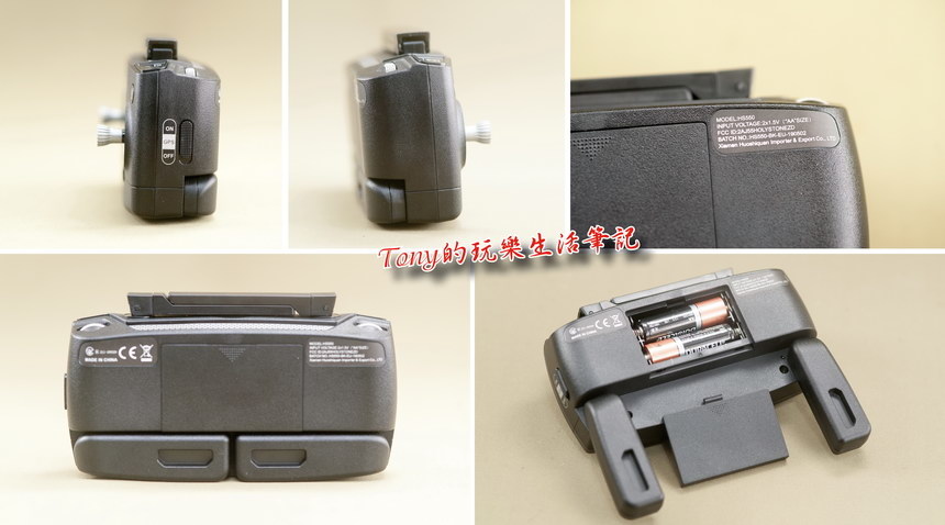 ▲遙控器使用兩個三號(AA)電池,在電池座下方有兩個握把可以拉出,方便持握的穩定方便。在右側還有一個GPS的信號開關,可以關閉GPS定位,在高階機種來說,關掉GPS訊號是增加飛行的控制靈敏度,但相對的就很不穩定些。以《Holy Stone HS550無人機》的入門練習定位來說,是不建議關閉,以免產生不可預期的問題,包括關閉GPS也是關掉一鍵返航的功能。
