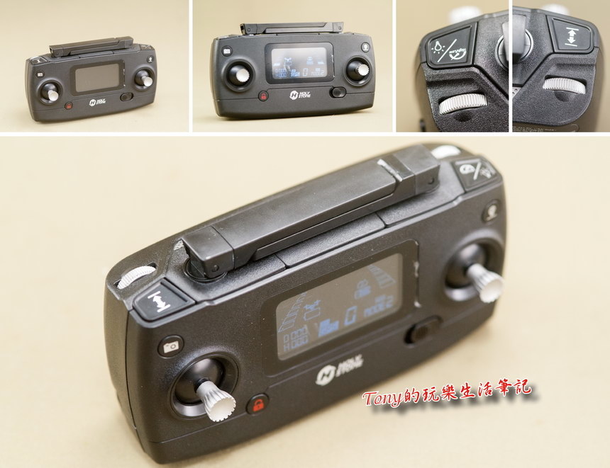 ▲再來看看遙控器,收折後的本體不大,但質感滿好的,所有的按鍵都是單一功能鍵,只有右手上方的按鍵,是短按控制機腹下方的燈光啟滅,長按為改變飛行速度。每一個按鍵的旁邊都印有各自的功能符號說明,是對應哪一個功能都很清楚。