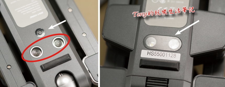 ▲左圖白色箭頭是《光流定位》的攝像頭,而紅圈的是《超音波穩定系統》,分別是用來讓停留滯空時可以穩定定位。右圖則是兩個白色燈光,在較黑暗的地方可以開啟,亮度不低。透過燈光來輔助《光流定位》的攝像頭作用。