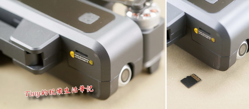 ▲搭載的SD卡插槽,記憶卡的格式需要為FAT32格式。這點試用過32GB及64GB的卡片,錄影上都沒有問題,但拍照時,64GB的卡卻會沒有存到檔案,這點大家可以也互相測試一下。記憶卡必須透過電腦格式化,在APP中我找不到可以格式化的地方,不知道是否會在未來在APP中加入這個功能(還是怕誤將拍好的影片給格式化掉,這算是一種防呆裝置嗎﹖)另外我計算過,飛行一次大約是拍到約1GB的容量(僅算連續錄影),這樣32GB的卡飛行個30次應該是夠拍攝的,還是以32GB的卡片較為保險,但得是C10 / U1以上的規格。