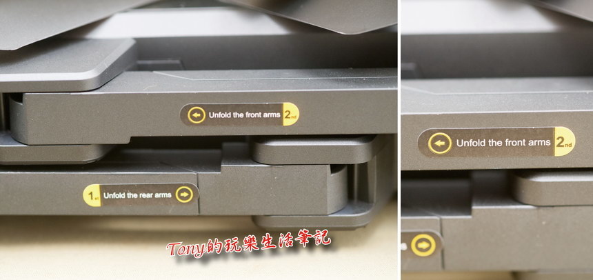 ▲前後四隻腳架是有分先後順序去拉開或收合,腳架上都有貼上說明貼紙。打開時先打開後方(下面的)腳架,再打開前方(上面的)腳架。收合腳架就要反回來,先收前方(上面的)腳架,再收後方(下面的)腳架。如果順序反了,腳架就會打結打不開來的。
