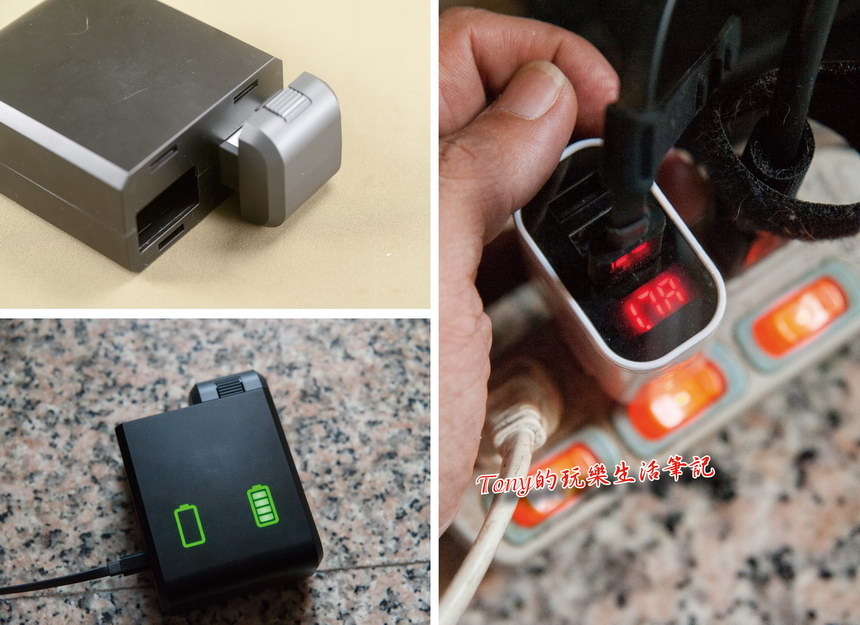 ▲充電座的使用方式,接頭為Type-C的接頭。單電池充電時,充電電流圍1.7安培左右。原廠充電座一次可充電兩顆電池,但不知是兩顆電池都是不是可以達到1.7安培的充電量就是了(充電座上有兩個Type-C的插座,應該是可以用兩個電源輸入來分別做1.7安培充電)。
