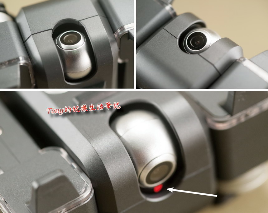 ▲趁著《Holy Stone HS550無人機》還沒有被我玩到給炸機前(有打算要來試一些障礙飛行,看看極限到哪邊),先空機來幾張外觀照片。鏡頭前面有一張保護膜,得從有個紅點那邊去撕下來。在四隻槳葉腳座下方,可以看出有一層透明片,在開啟電源後,會依現有的狀態去顯示藍/紅/黃等燈號。正確設定好後,會變成前方雙槳為紅燈,後方雙槳為藍燈的辨識燈號。