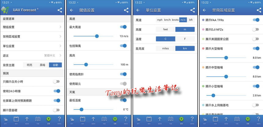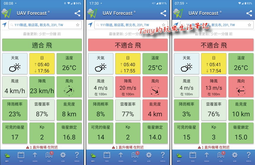 另外建議安裝《SkySentry》、《UAV Forcast for DJI Quadcopter & UAV Drone Pilots》、《中央氣象局APP》。其中《SkySentry》是用來查詢是否是會在禁航區或是限航區,以免起飛後才發現觸法了。而《UAV Forcast for DJI Quadcopter & UAV Drone Pilots》、《中央氣象局APP》則是用來觀測天氣風向用的,特別是《UAV Forcast for DJI Quadcopter & UAV Drone Pilots》可以先設定好一些數據,打開APP後就能直接知道適不適合飛行,這是很好用的軟體。畢竟每款無人機所能承受的風力大小不同,最好先瞭解一下自己手中無人機的抗風性如何,免得起飛後被帶到找不回的地方(我已知有幾部很高級的無人機就是這樣被吹到找不回來的)。