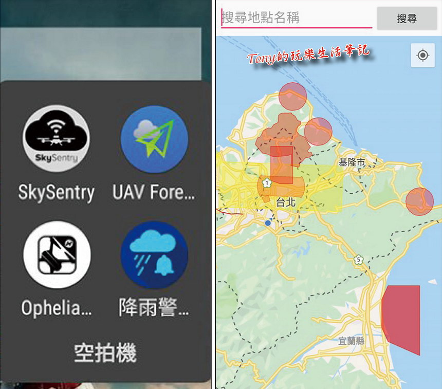 ▲左圖就是我推薦要安裝幾個APP,包括有《SkySentry》、《UAV Forcast for DJI Quadcopter & UAV Drone Pilots》、《中央氣象局APP》這幾個很重要的APP。右邊就是、《UAV Forcast for DJI Quadcopter & UAV Drone Pilots》所顯示出來的禁航(紅色)與限航(黃色)的區塊,至少先看一下是否在不可飛行的區域,以免觸法。