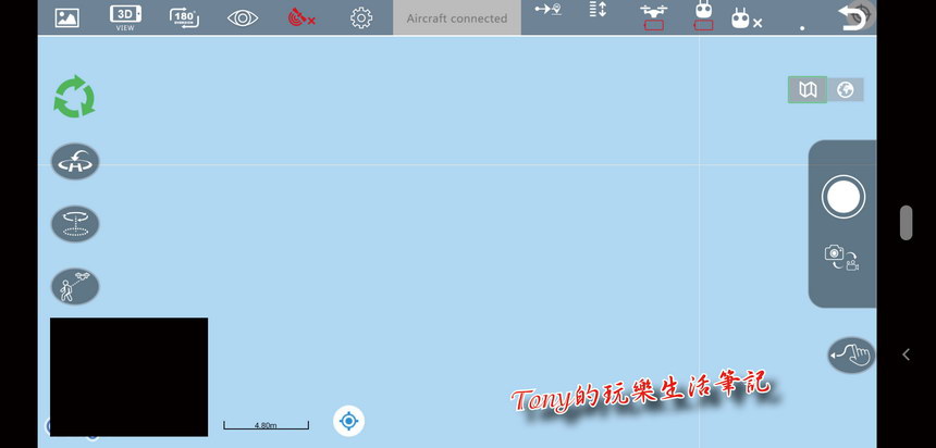 ▲進入專用的《Ophelia GPS》APP,畫面上一堆訊息,中間的黑塊就是圖傳系統傳回的影像區。點擊影像區左下角的小方塊中的十字圖標,就可以在地圖與實景中切換。也可以將左下角的第二影像區給關閉的。