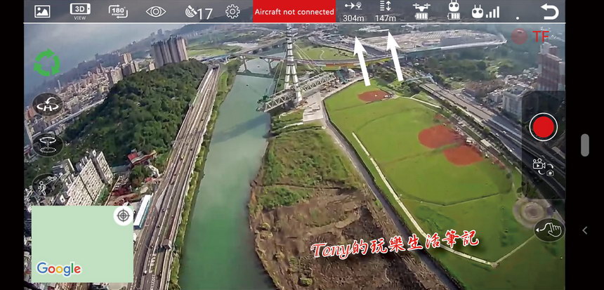 實飛高度約在150公尺(之前因為幾次試飛陣風都不小,所以僅測到約60~70公尺就飛不上去了),在距離方面也達到了300公尺(之前都只測到大約150公尺內),都是差不多目視可見最遠的距離,沒有辦法達到標示的圖傳500公尺及遙控的1600公尺,但就《Holy Stone HS550無人機》的抗風性與其它性能來說,這樣也就夠了,不然飛的太遠,萬一有狀況,真的是很難去控制或找回來的。這圖片是今天天氣還不錯,趁著陣風不大,去測試最高最遠的距離。最高到147公尺,最遠到304公尺(直線距離大約是335公尺)。圖傳部份,則是大約接近斷線前就開始會斷續,然後畫面完全中斷。之後隔了一段時間(大約3到5分鐘),才又接收到《Holy Stone HS550無人機》的連線訊號(此時畫面依然中斷中),趁著有收到連線訊號,此時點下《一鍵返航》,讓HS550自行飛回,順利的將《Holy Stone HS550無人機》飛回來。