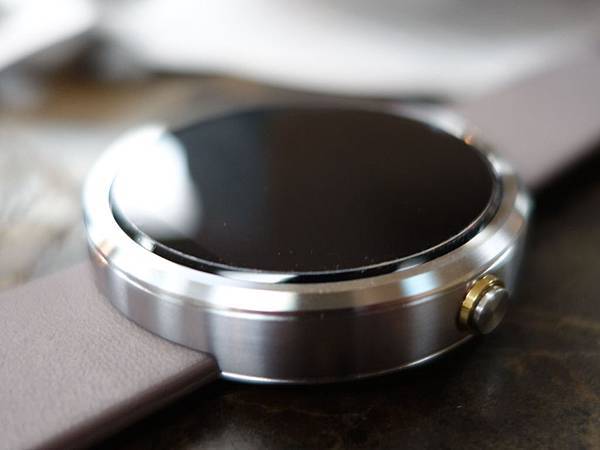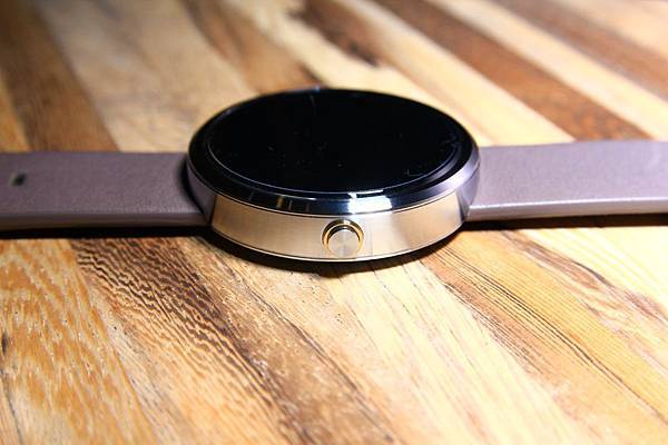 不論觸控性裝置多好用,一顆電源鍵總少不了。Moto 360的唯一一顆按鍵, 是模仿傳統手錶的調時鈕來設計,按鈕外圍還有金色飾圈,同樣的十分有質感。按鈕手感OK,不過你應該不會經常按他,因為Moto 360的所有操作,包含解鎖和關掉螢幕,都能靠手勢完成。