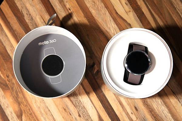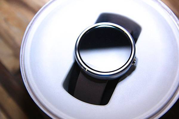 取出Moto 360,一窺真面目!簡單的外形,不想一般的科技產品有太濃厚的高科技味,Moto 360整個就是十分簡約,如果不是錶面中心是一整片黑,其實根本就像一塊一般的精品手錶。