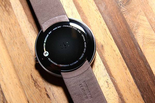 背面是鏡面的塑膠材質,中間有很漂亮的花紋,不過看來應該蠻容易刮傷的?正中間有心跳感測器,旁邊的文字說明了Moto 360有IP67防水防塵,防塵級別達到最高,且能在1m以內的水下浸泡30分鐘,當然小宇是不會想把Moto 360的皮革錶帶泡30分鐘啦...