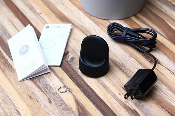 Moto 360的配件其實也很有看頭,除了說明書等文件外,還有無線充電座和變壓器一組。