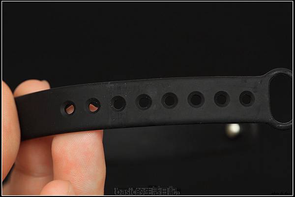 剛從盒中拿出的小米手環 , 這個橡膠帶看起來不起眼 , 不過帶扣的設計蠻理想的 , 要先穿過一個環 , 再用力的扣下去..