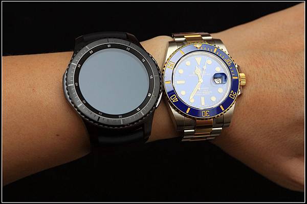 如果對Gear S3的大小沒什麼概念的話 , 右邊那支的錶逕是40mm , Gear S3應該有43~44mm的錶徑..