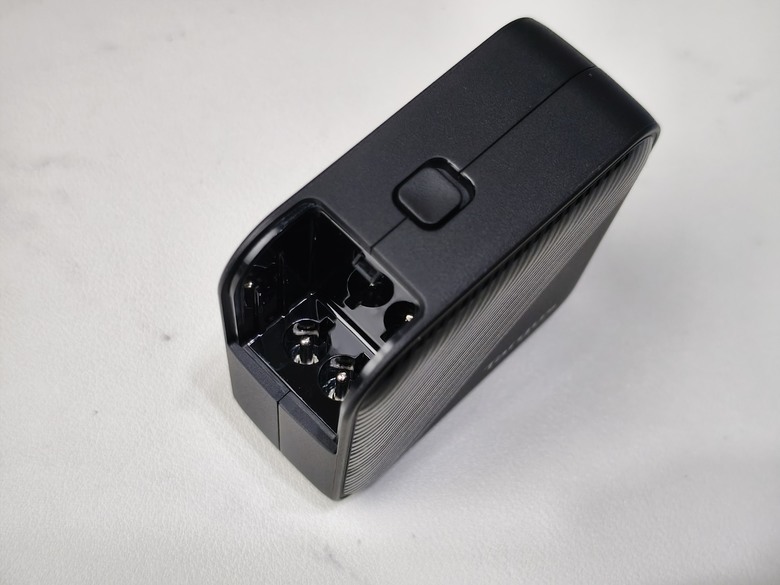 另外雖然支援不同國家的插頭,但是設計上還是貼合充電器圓弧造型組合起來就是一個完整性,後方可以看到有卡扣孔和下方接電口,兩側滑動卡軌。
