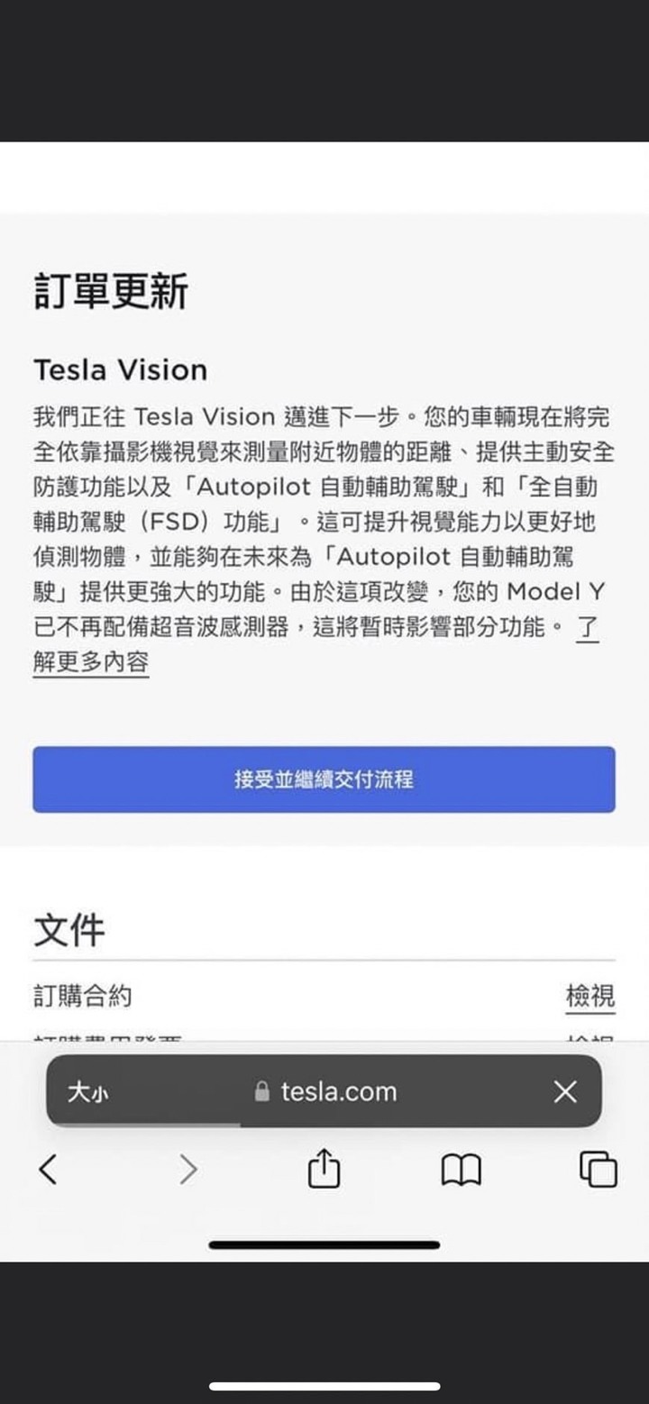 台灣特斯拉官網客服指出,車主在交車前有個訂單合約,裡面就有提到Model Y全車移除超音波感測器的部分,以及移除後會造成Autopilot(EAP增強版自動駕駛輔助)與FSD(全自動輔助駕駛)的一些功能無法使用,上述都有載明在合約中,而該份合約也都是經由車主簽署確認的。