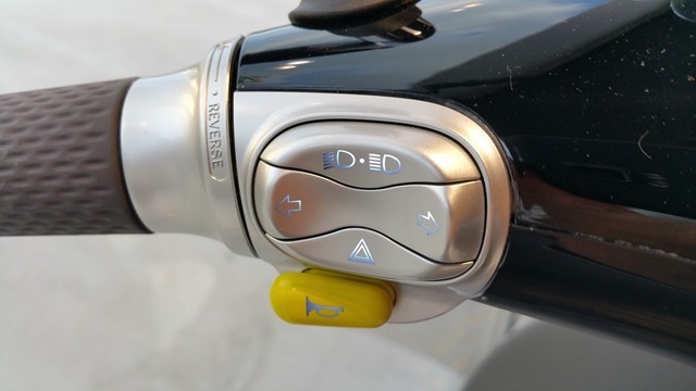 將左手把旁的REVERSE開關向上轉動,就可以時速1公里的速度倒車,對於不好倒車或力氣比較小的女生來說,是很方便的設計。