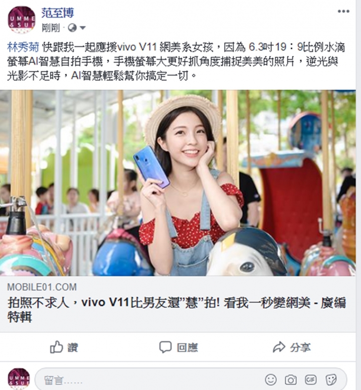 「快跟我一起應援vivo V11 網美系女孩,因為 V11有AI光效怎麼拍都好看」