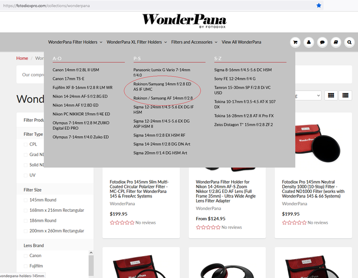 如果要使用濾鏡的話目前似乎只能購買Samyang自己推出的套件 正考慮這支的AF,不過看官網 samyanglens.com 似乎沒有配濾鏡的產品,除了變形有點嚴重和不能裝濾鏡以外,沒有可以挑剔的了 是可以裝濾鏡,但花的錢好像會不少,(好像是)美國公司 Fotodiox 的(好像是)品牌 Wonder Panahttps://fotodioxpro.com/collections/wonderpana—==@@@==—(好像是)一家美國公司 Panavision 所持有的 Lee Filters 公司,其中的濾鏡組裝系統 sw-150https://www.leefilters.com/index.php/camera/system-sw150網頁裡有影片介紹組裝方法(好像是),—==@@@==—(好像是)cn國品牌 nisi,https://en.nisioptics.com/可惜這個官網(En)好像沒有搜尋功能,所以找不到到底那些是給 Samyang 和 Rokinon的14mm所用的濾鏡組裝件,網上是有,如需要搜尋,關鍵字詞句是 NiSi 150mm Q Filter Holder,我在美國相機店 B&H 看到的,https://www.bhphotovideo.com/c/product/1536051-REG/nisi_nip_fh150_syaf14cn_150mm_q_filter_holder.html/overview另看到台灣的一些網購是有 nisi 濾鏡產品出售,不妨找找看,—==@@@==—以上3家是因為最近在考慮這支或 Rokinon 的 AF 14mm給 sony 用的,所以看到這些,但不確定能否給 canon 用,參考參考