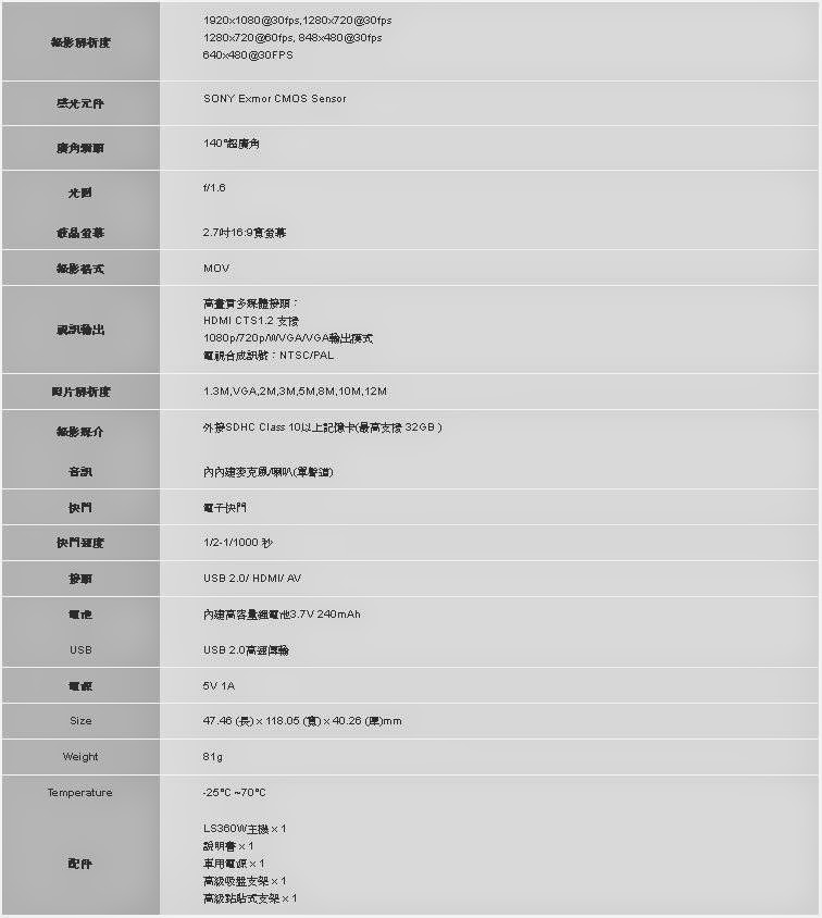 截圖自DOD Tech Co.,Ltd. LS360W規格說明