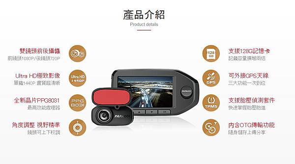 擁有前後雙鏡頭紀錄、還可支援胎壓偵測、OTG即時傳輸、 Ultra HD 1440P等功能..