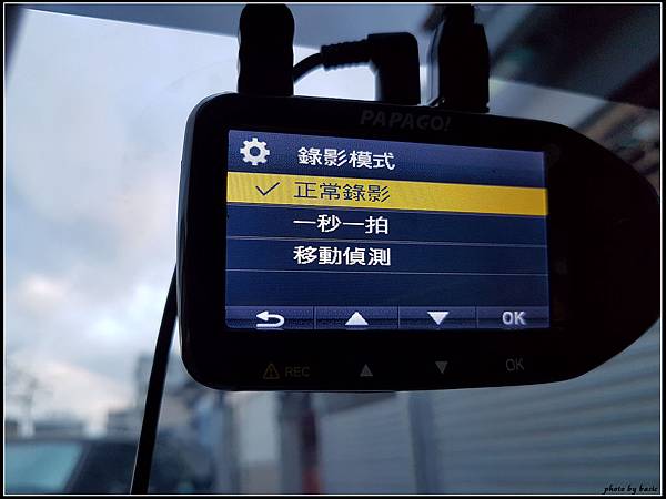 錄影模式可調為正常錄影或是一秒一拍 , 停車時也可調為移動偵測..