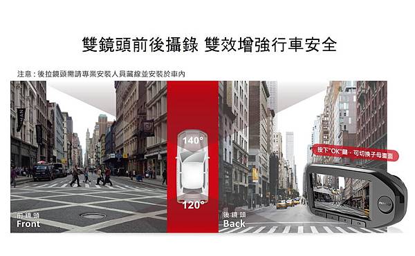 140度的廣角能將車頭兩旁的景物都照的相當清楚, 有助於真的發生事故時的責任歸屬辨視..