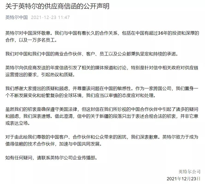 今天intel就求饶了,说我们不是想对新疆说啥,只是不这么说就不合美国法律,其实这句话一点意义都没有。