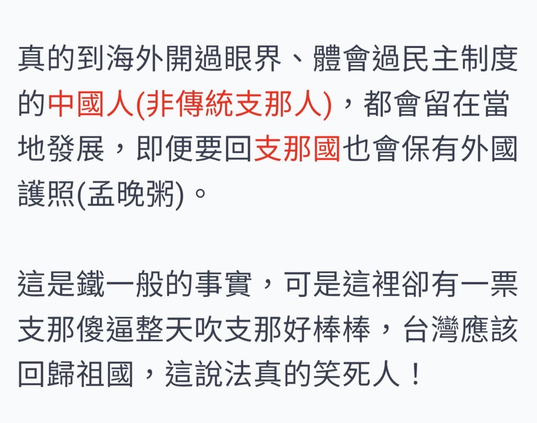 真的到海外開過眼界、體會過民主制度的中國人(非傳統支那人),都會留在當地發展,即便要回支那國也會保有外國護照(孟晚粥)。...(恕刪)